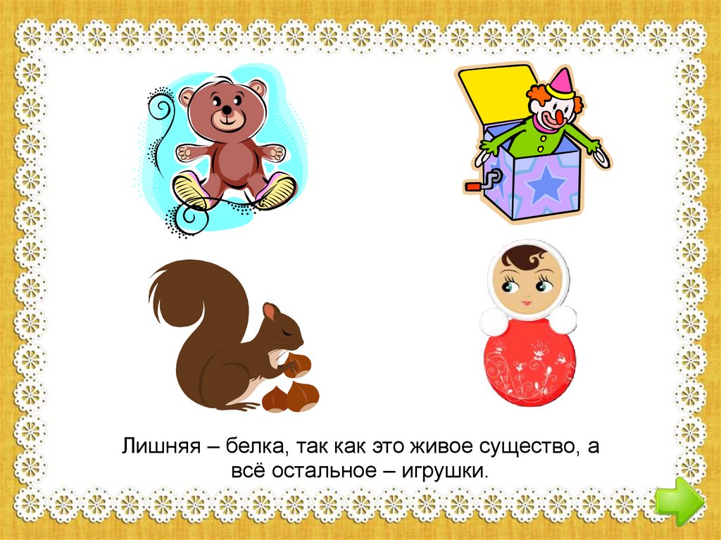 Лишняя – белка, так как это живое существо, авсё остальное – игрушки.