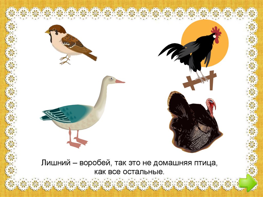 Лишний – воробей, так это не домашняя птица,как все остальные.