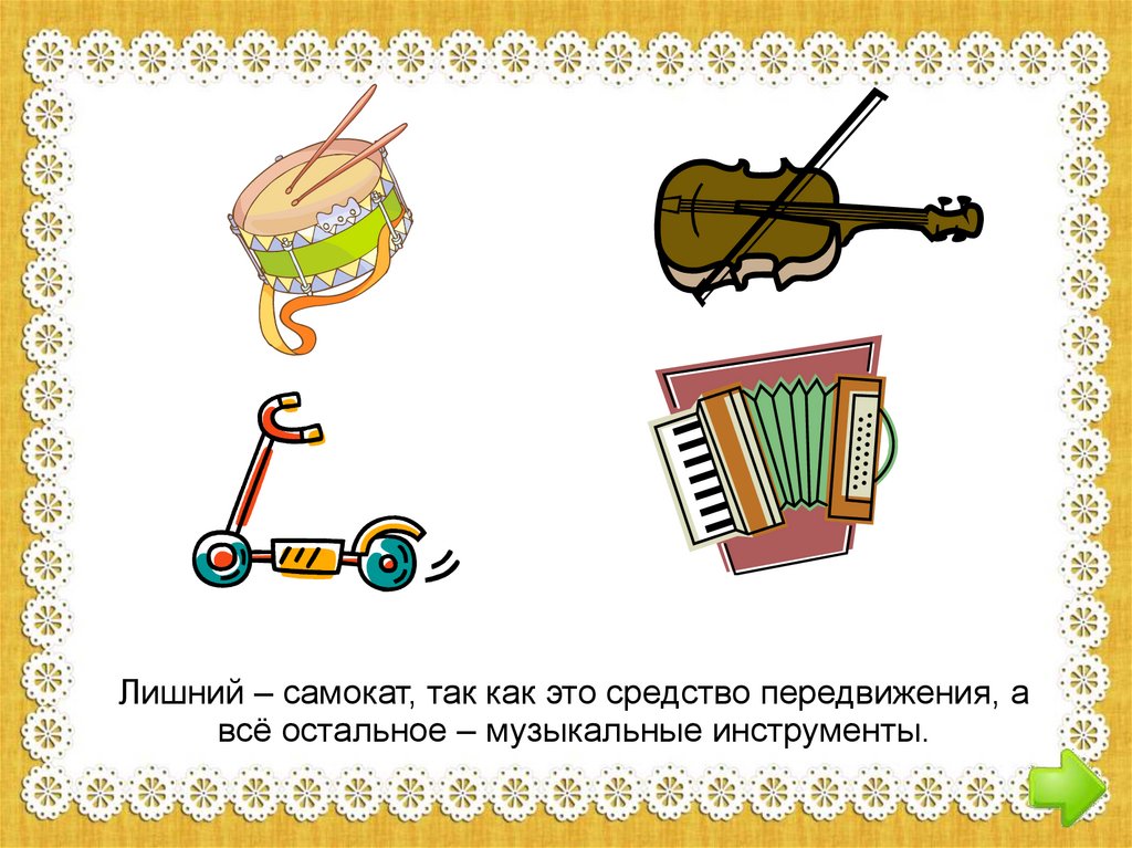 Лишний – самокат, так как это средство передвижения, авсё остальное – музыкальные инструменты.