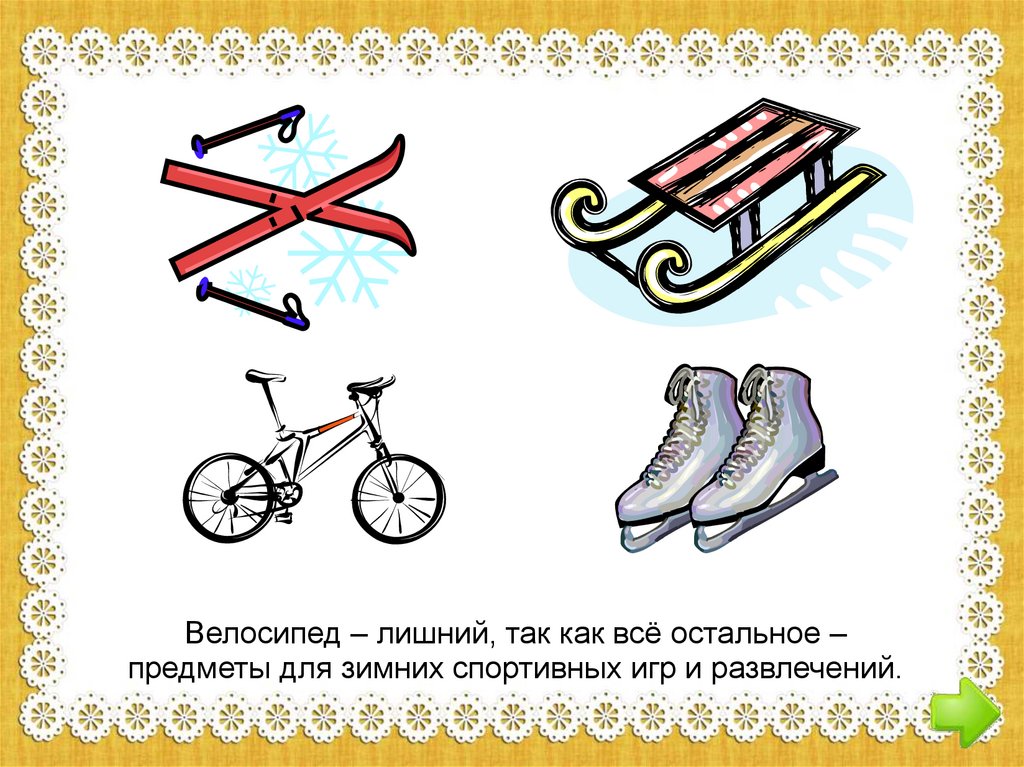 Велосипед – лишний, так как всё остальное –предметы для зимних спортивных игр и развлечений.