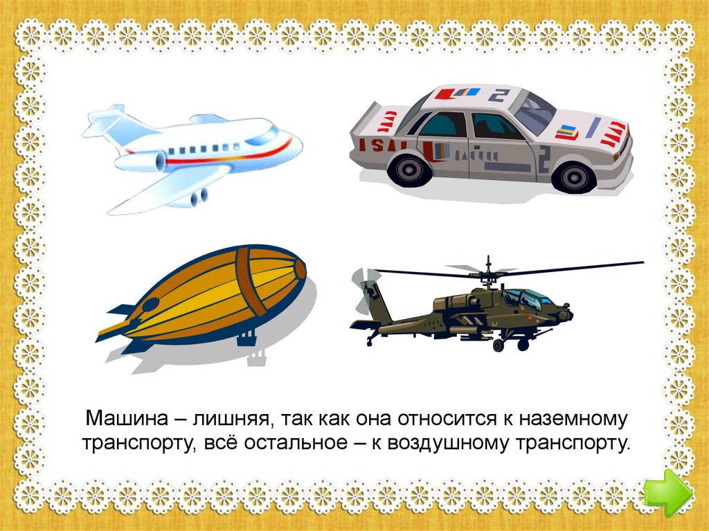 Машина – лишняя, так как она относится к наземномутранспорту, всё остальное – к воздушному транспорту.