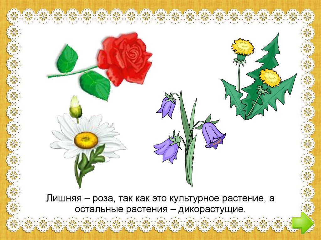 Лишняя – роза, так как это культурное растение, аостальные растения – дикорастущие.