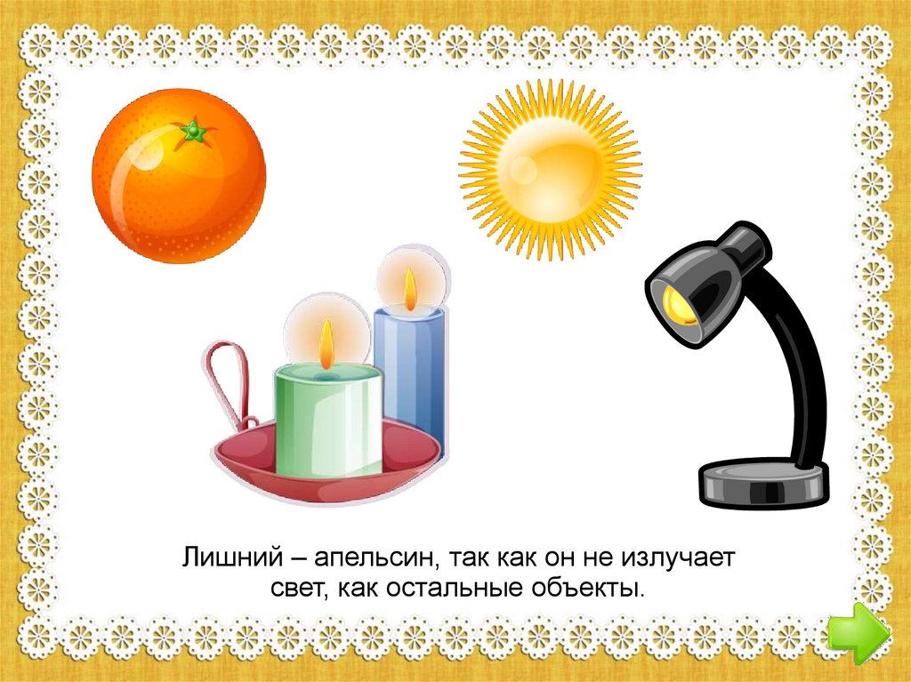 Лишний – апельсин, так как он не излучаетсвет, как остальные объекты.