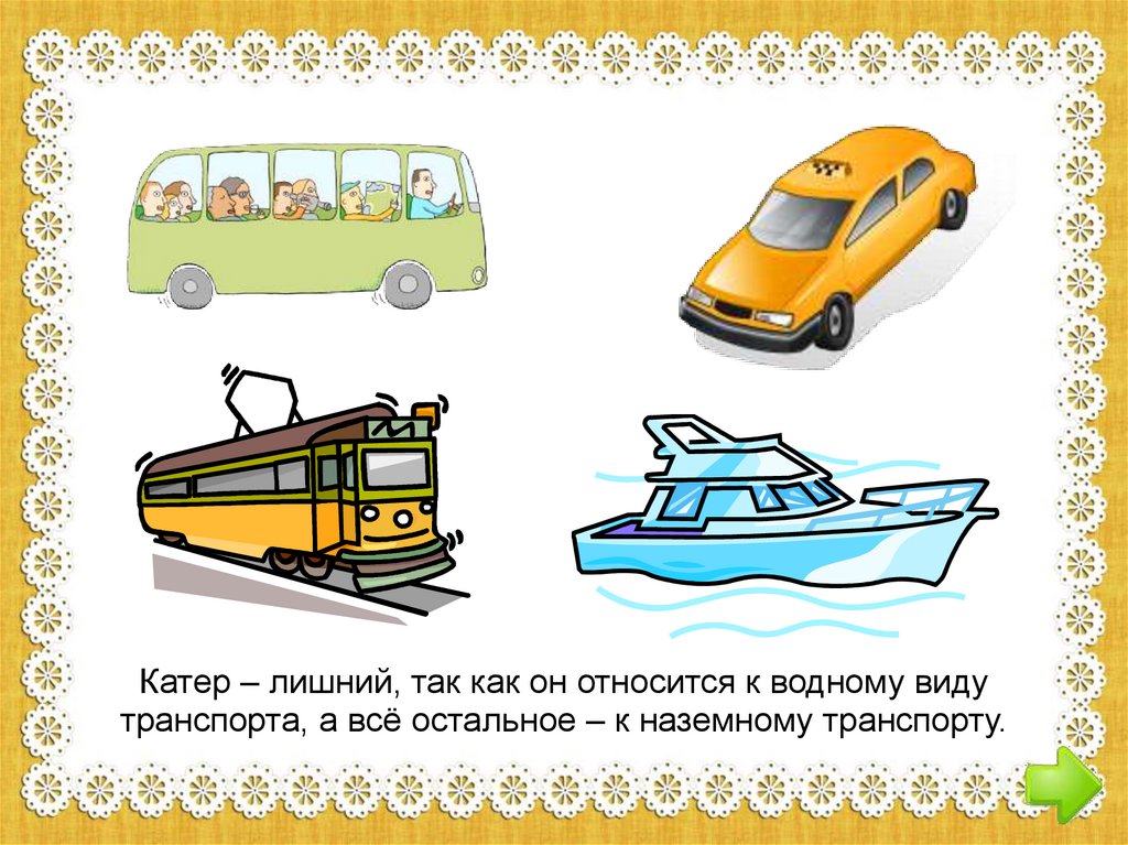 Катер – лишний, так как он относится к водному видутранспорта, а всё остальное – к наземному транспорту.