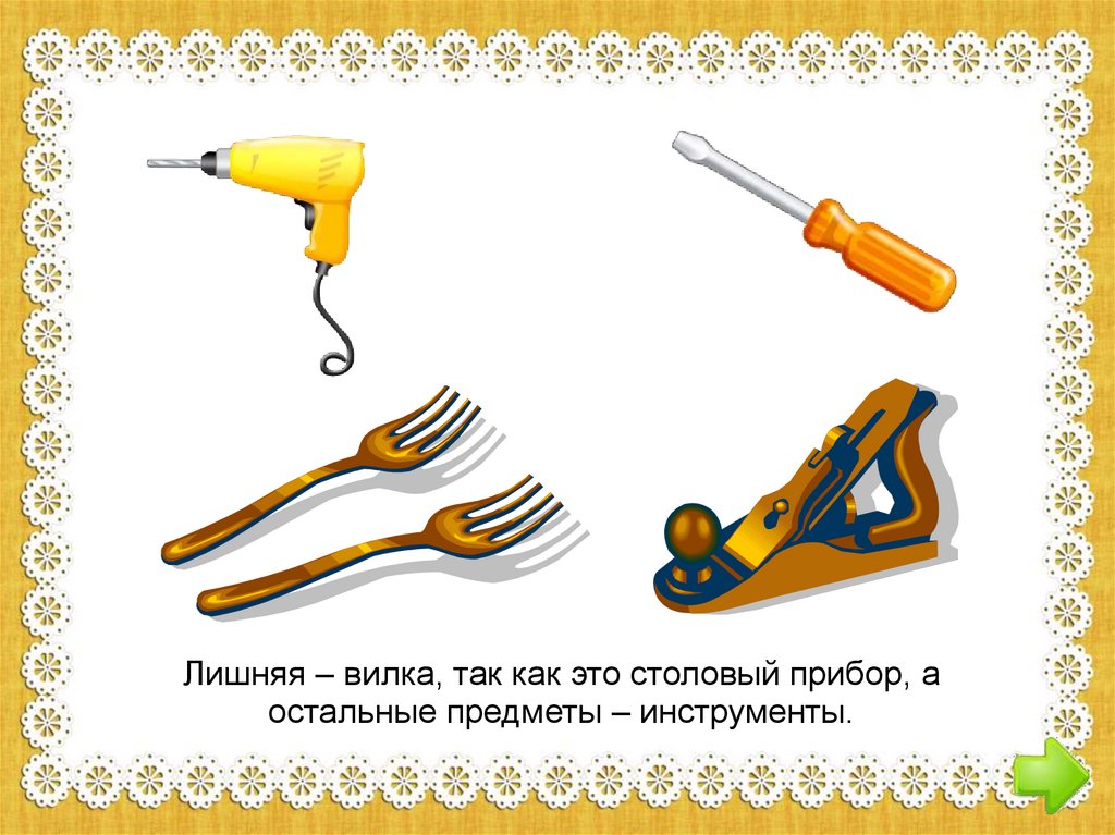 Лишняя – вилка, так как это столовый прибор, аостальные предметы – инструменты.