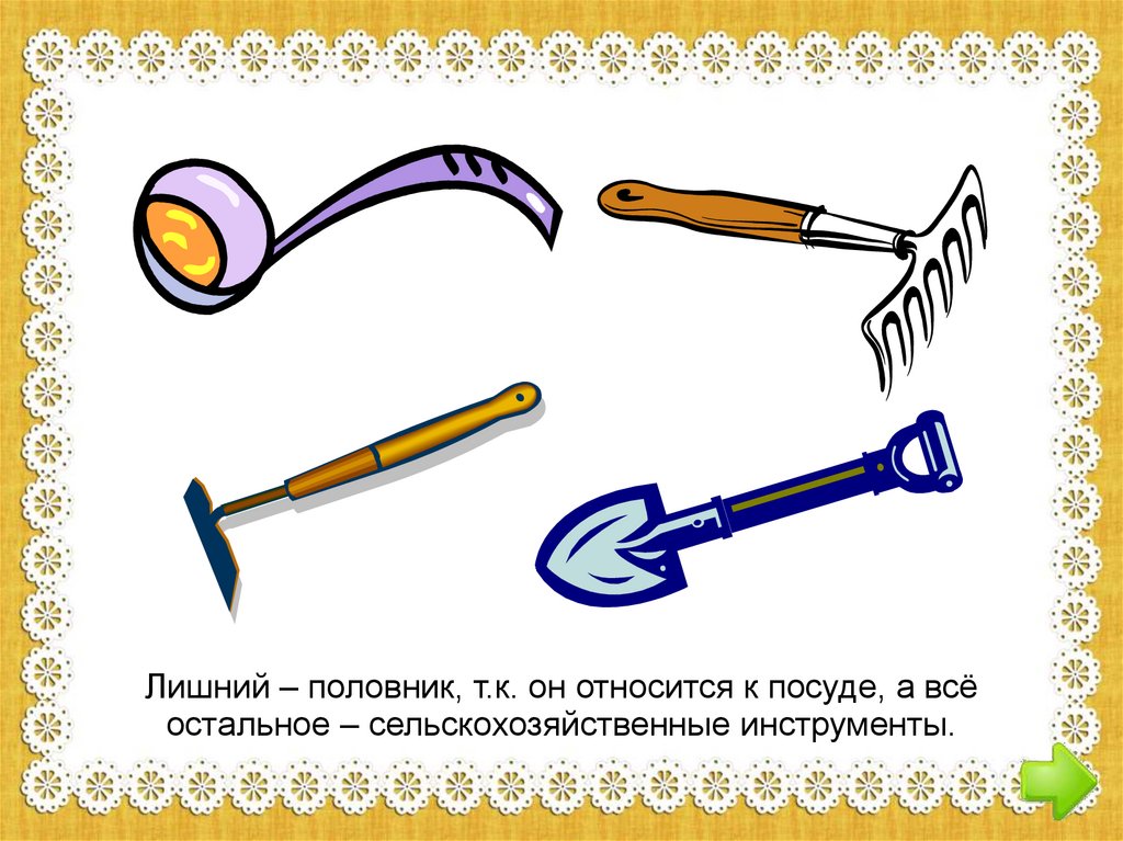 Лишний – половник, т.к. он относится к посуде, а всёостальное – сельскохозяйственные инструменты.
