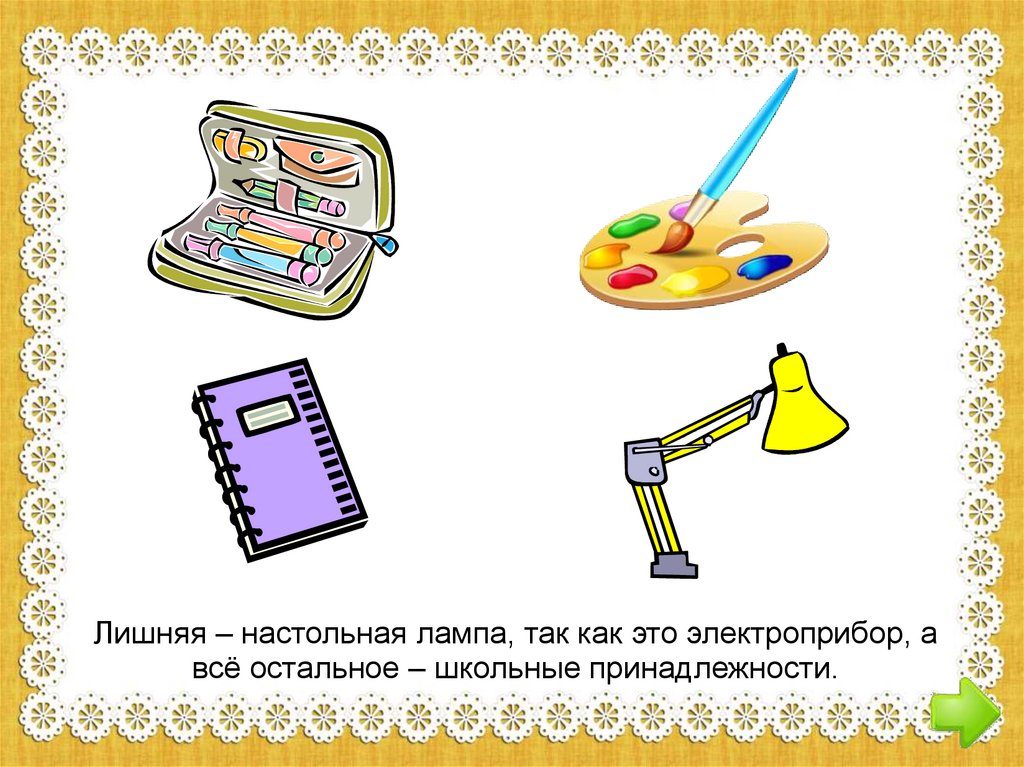 Лишняя – настольная лампа, так как это электроприбор, авсё остальное – школьные принадлежности.