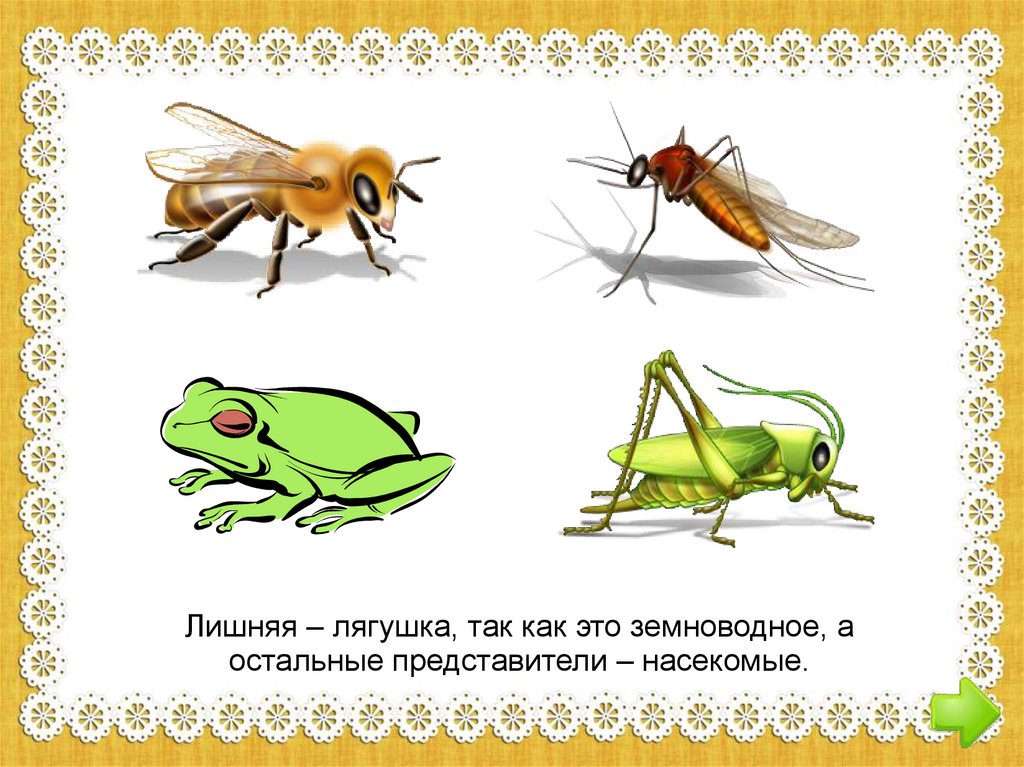 Лишняя – лягушка, так как это земноводное, аостальные представители – насекомые.