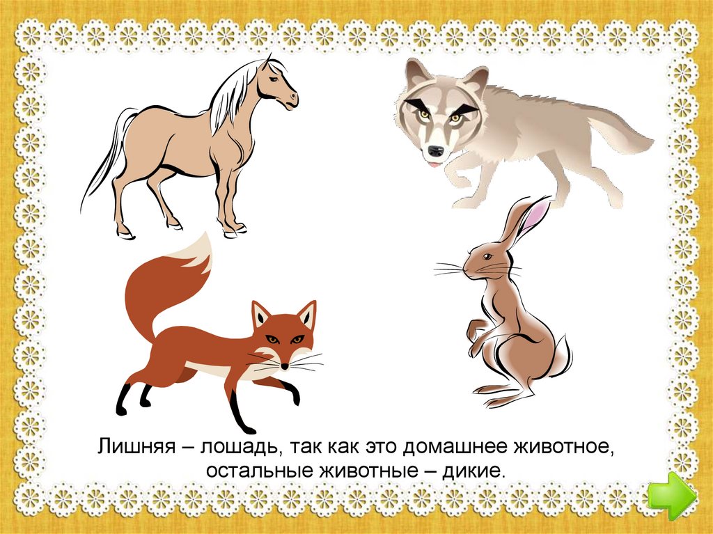 Лишняя – лошадь, так как это домашнее животное,остальные животные – дикие.