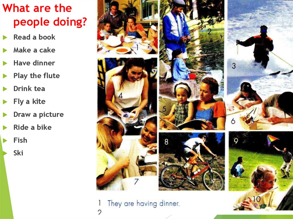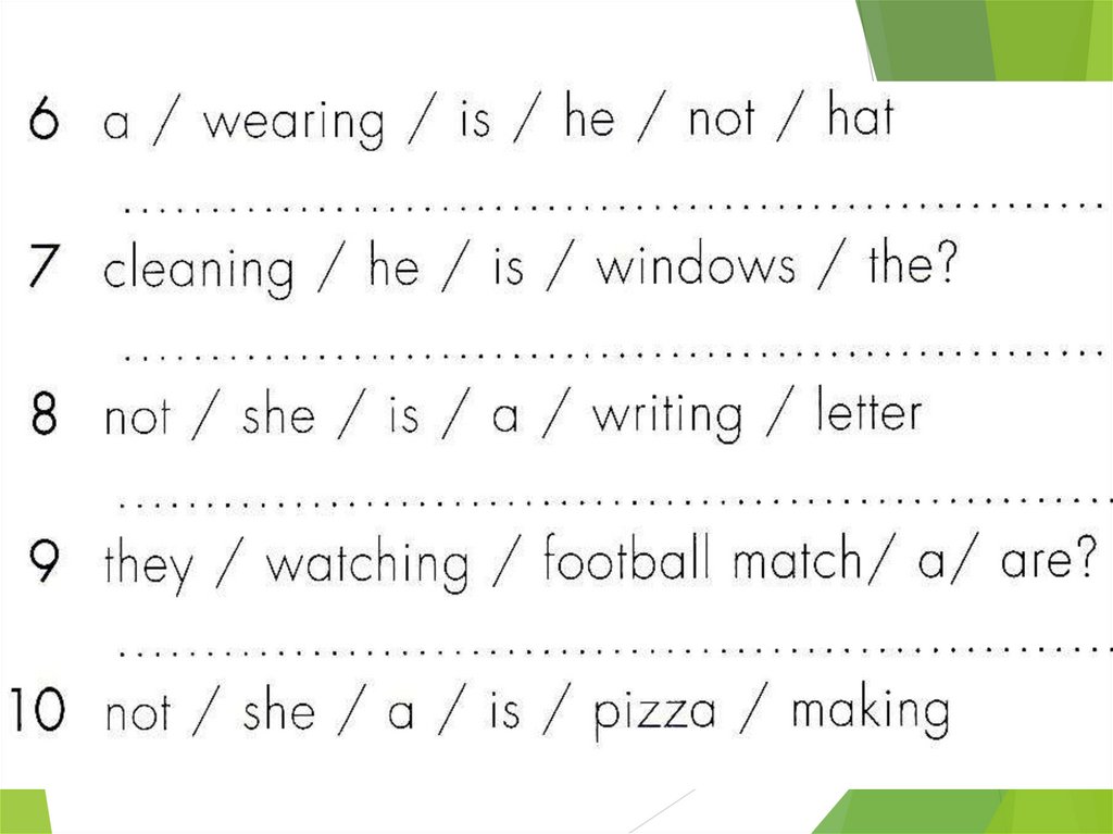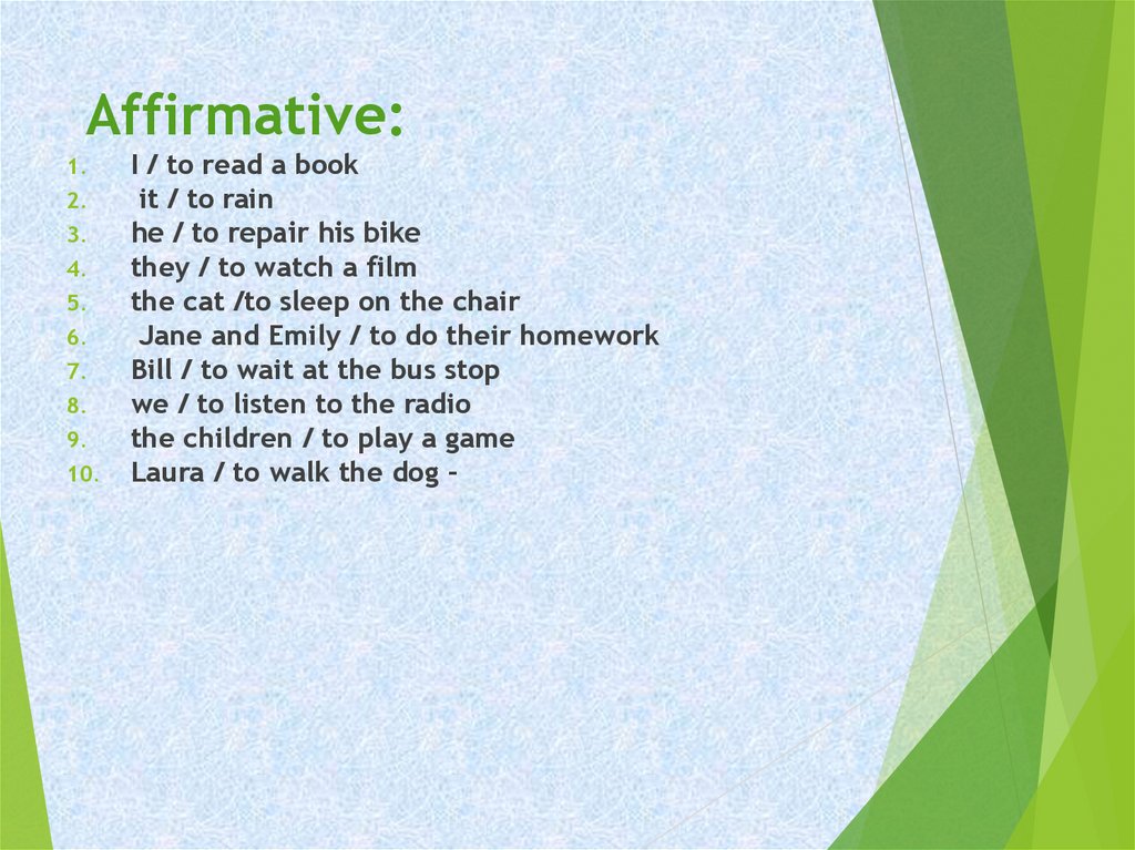 Peter / to go / to the cinema 2. they / to play / a game 3. she / to listen /to the radio 4. I / to dream 5. they / to pack / their bags 6. you / to do / the washing-up 7. we / to talk / too fast 8. they / to clean / the windows 9. she / to watch / the news 10. you / to pull / my leg 1.