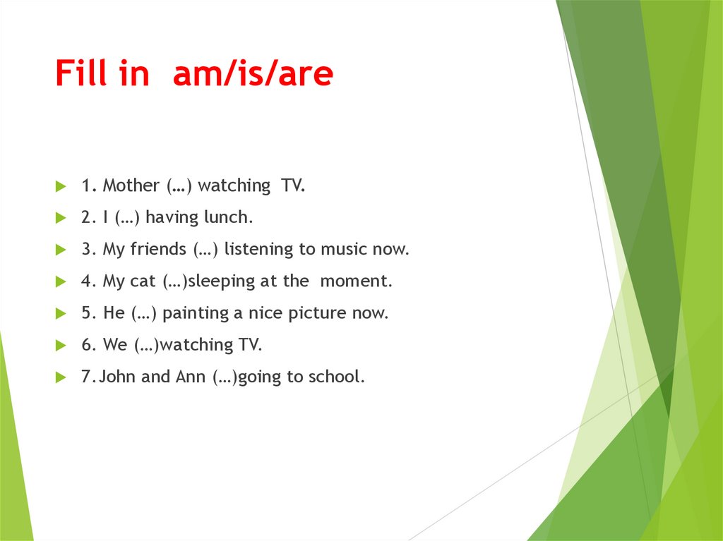 Fill in am/is/are1. Mother (…) watching TV.