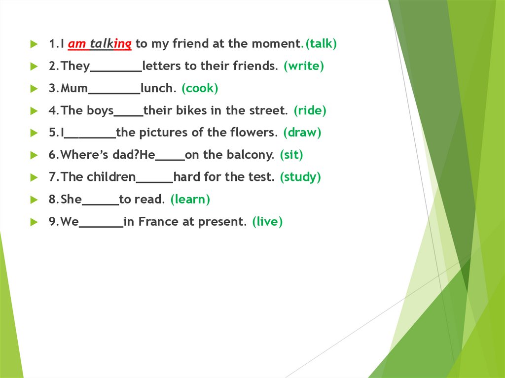 1.I am talking to my friend at the moment.(talk)2.They_______letters to their friends. (write)