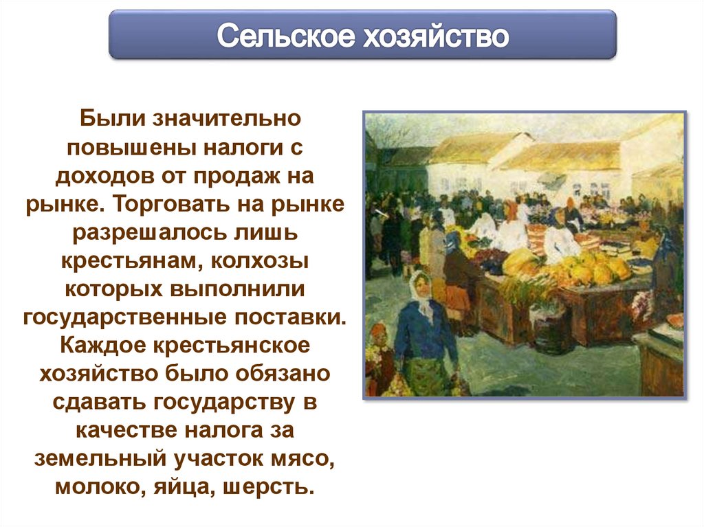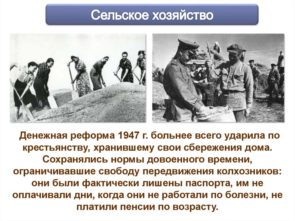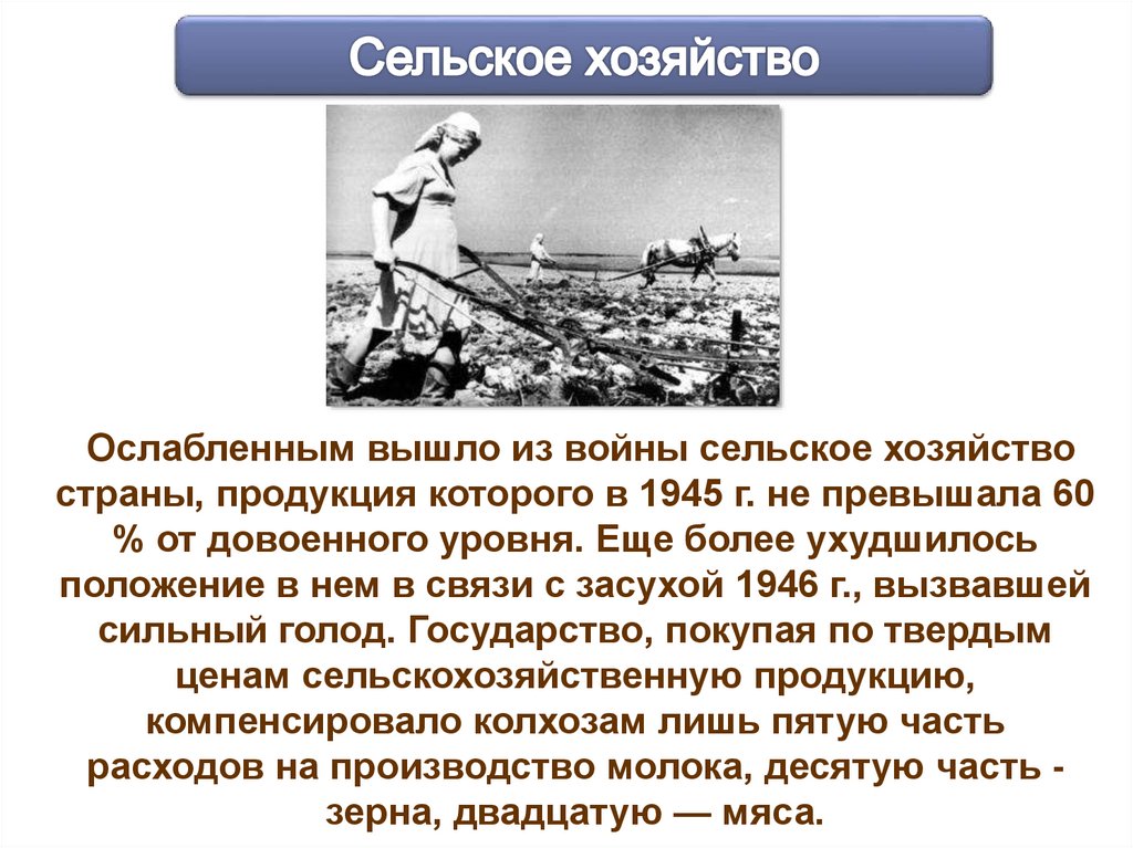 Жизнь в деревне была гораздо беднее городской.• Первые годы после войны многие крестьяне на разоренных войной