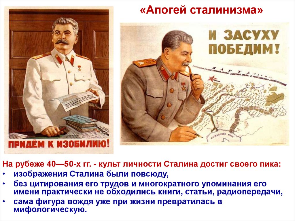 «Апогей сталинизма»На рубеже 40—50-х гг. - культ личности Сталина достиг своего пика:
