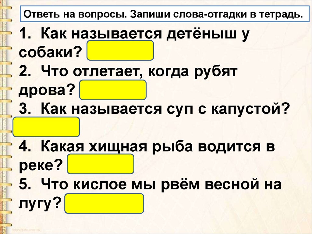 Ответь на вопросы. Запиши слова-отгадки в тетрадь.1. Как называется детёныш у