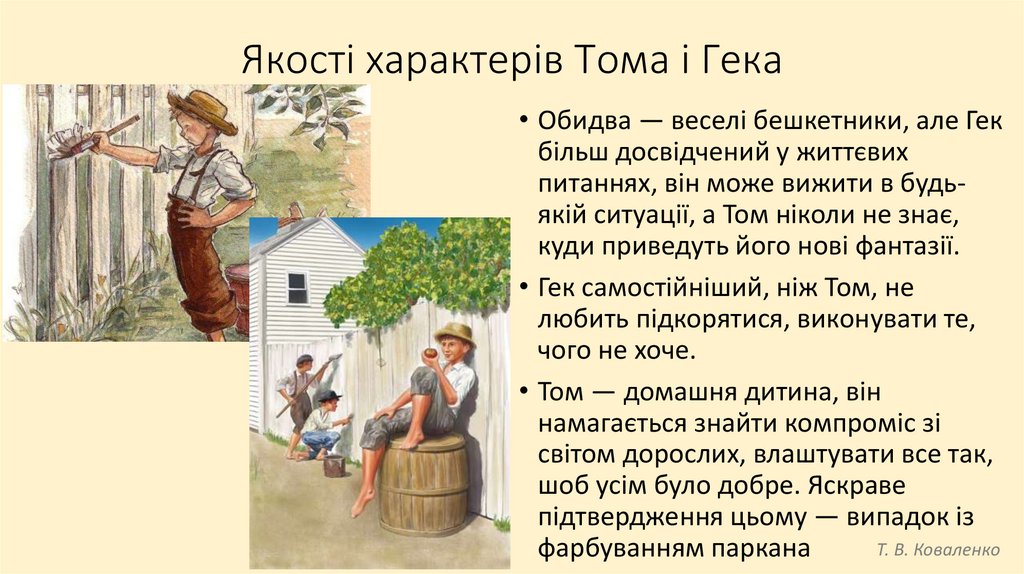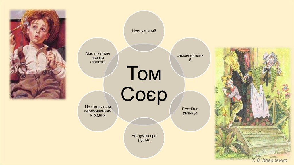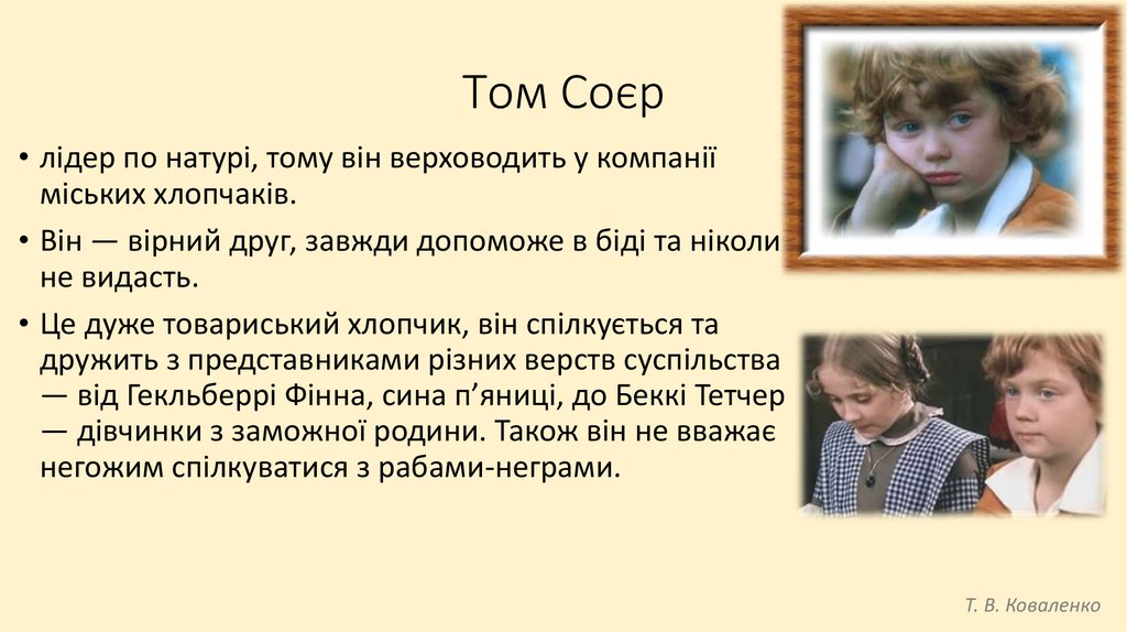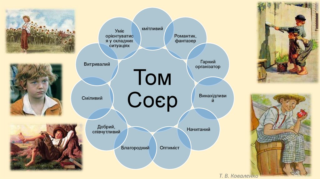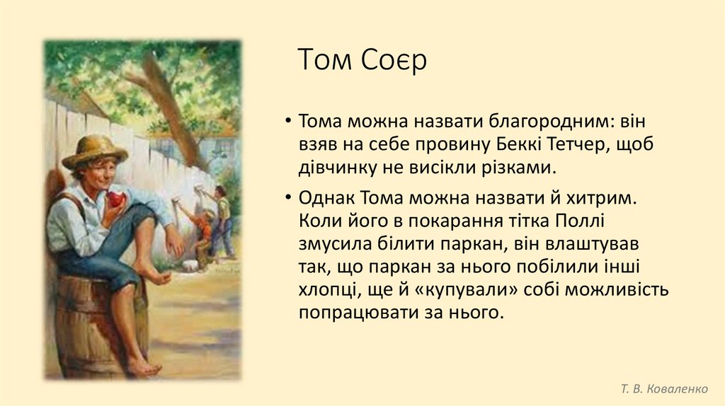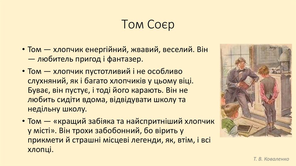 Том Соєр• Том — хлопчик енергійний, жвавий, веселий. Він