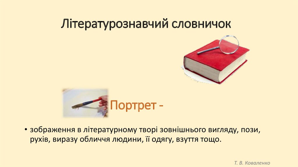 Літературознавчий словничокПортрет • зображення в літературному творі зовнішнього вигляду, пози,