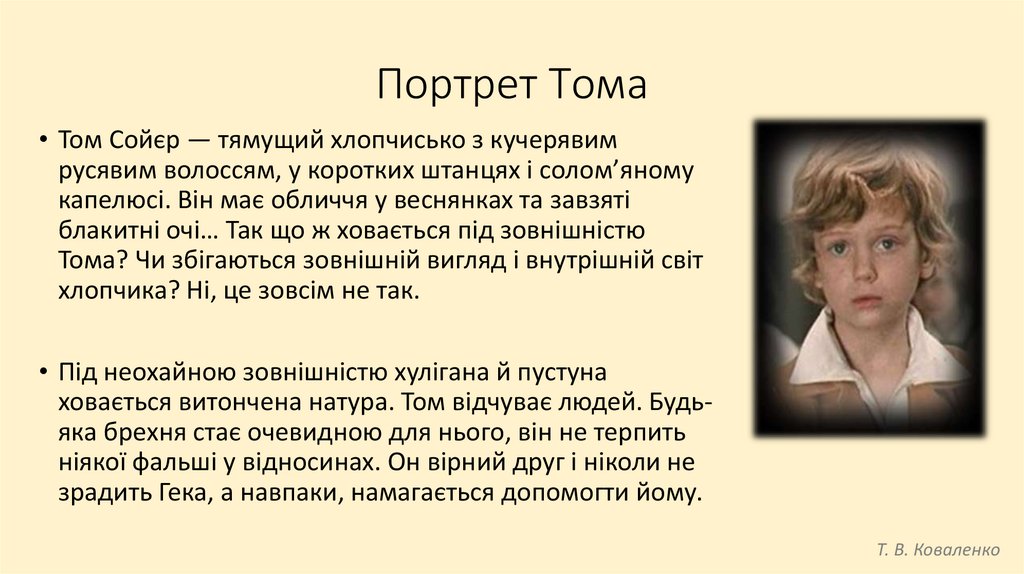 Портрет Тома• Том Сойєр — тямущий хлопчисько з кучерявим