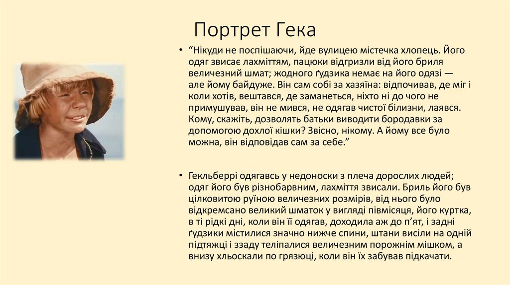 Портрет Гека• “Нікуди не поспішаючи, йде вулицею містечка хлопець. Його