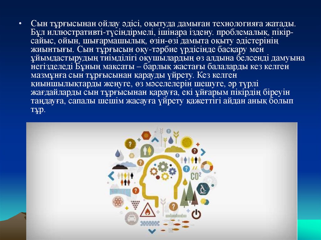 • Сын тұрғысынан ойлау әдісі, оқытуда дамыған технологияға жатады.Бұл иллюстративті-түсіндірмелі, ішінара іздену. проблемалық, пікірсайыс, ойын, шығармашылық, өзін-өзі дамыта оқыту әдістерінің