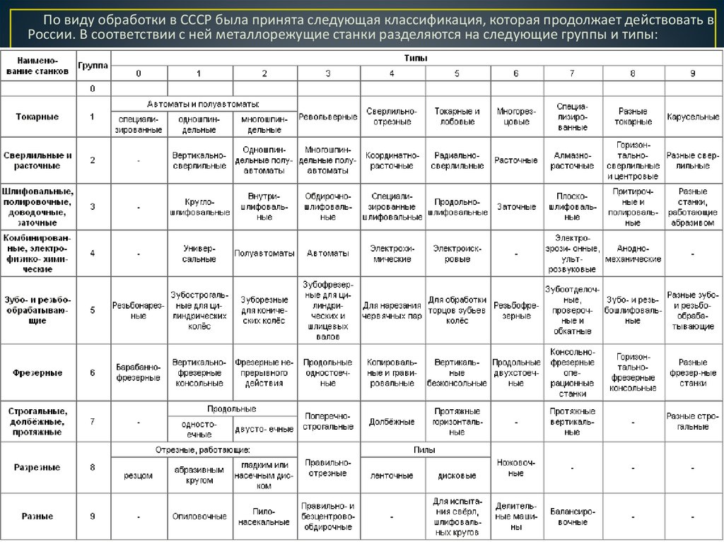 По виду обработки в СССР была принята следующая классификация, которая продолжает действовать вРоссии. В соответствии с ней металлорежущие станки разделяются на следующие группы и типы: