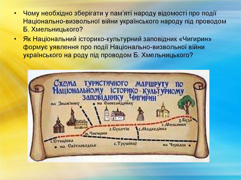 • Чому необхідно зберігати у пам’яті народу відомості про подіїНаціонально-визвольної війни українського народу під проводом