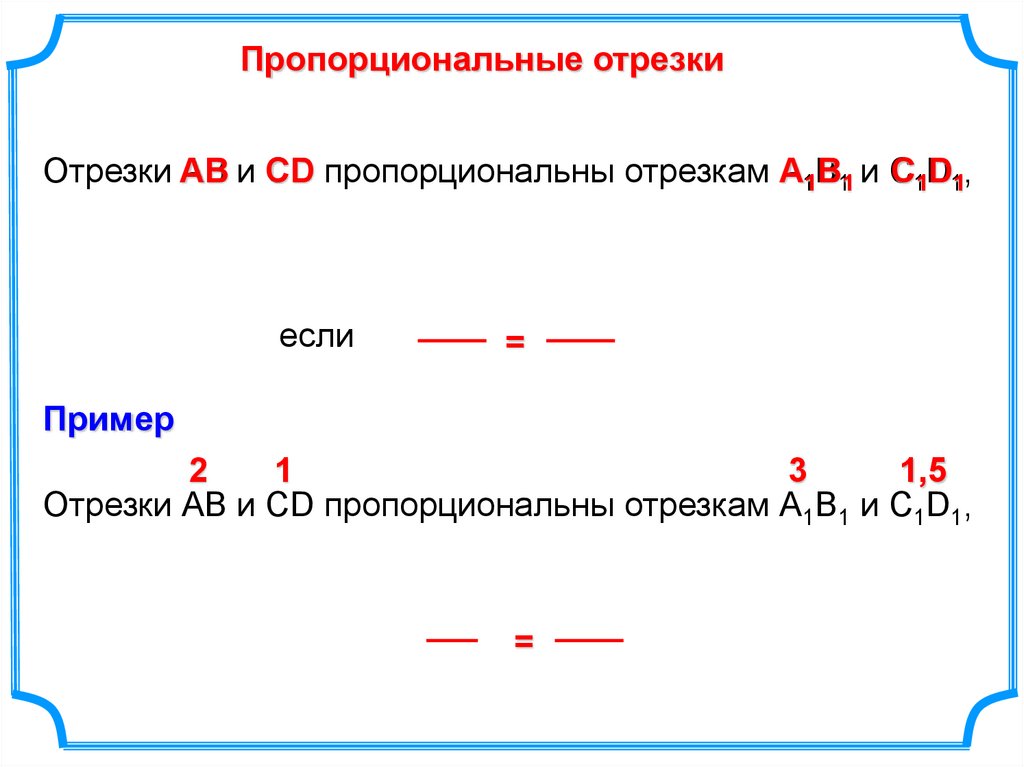 Пропорциональные отрезкиОтрезки АВ и СD пропорциональны отрезкам А1В11 и С
