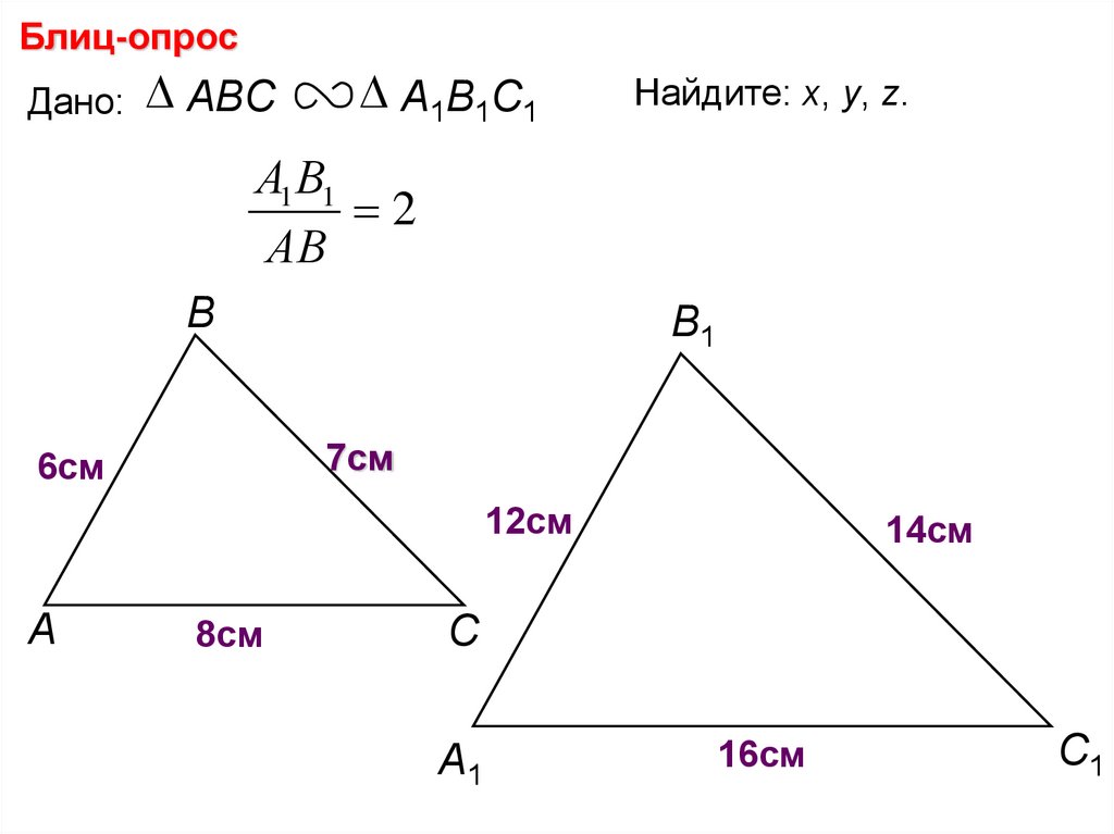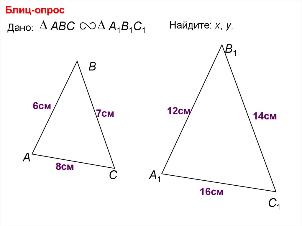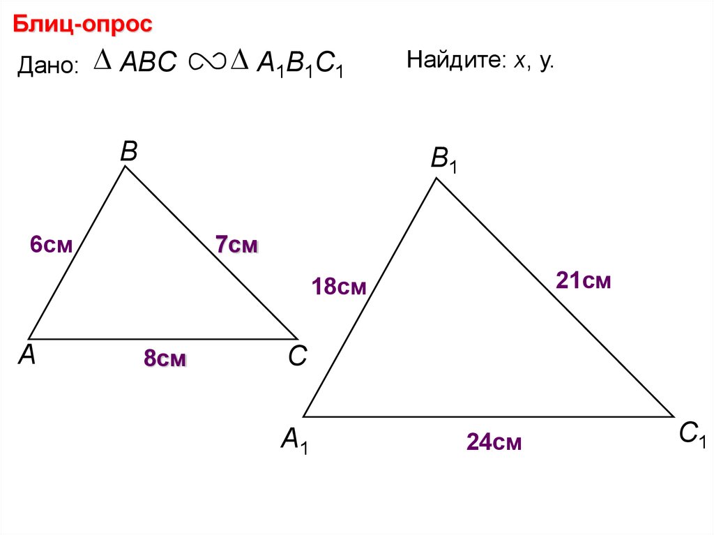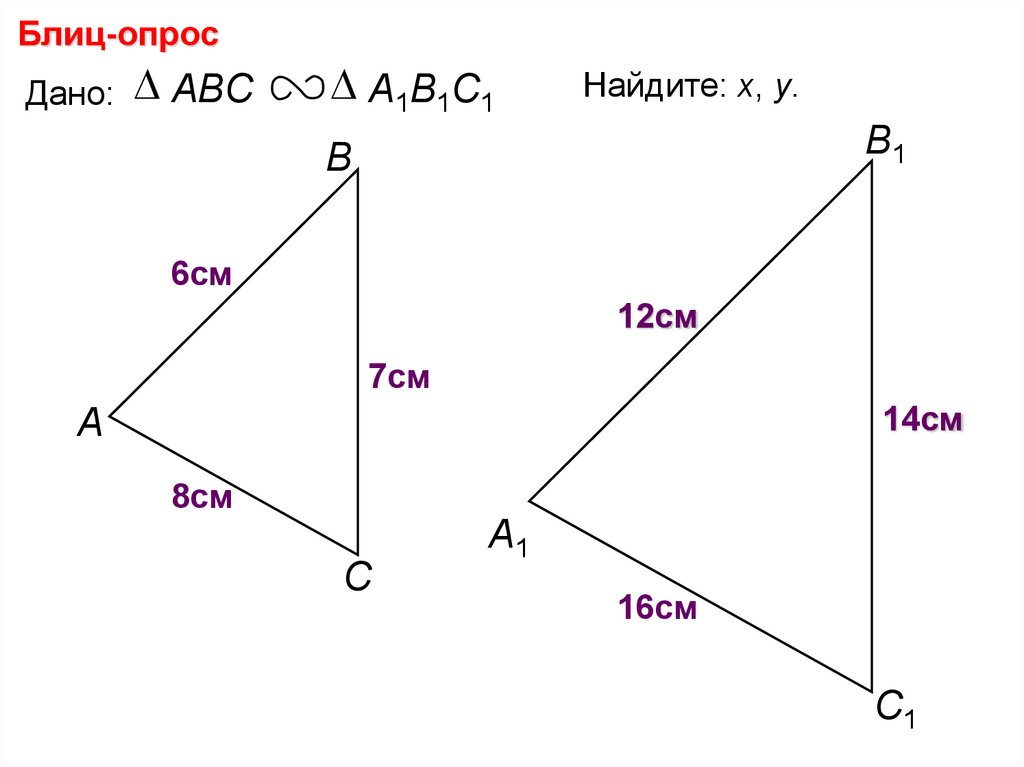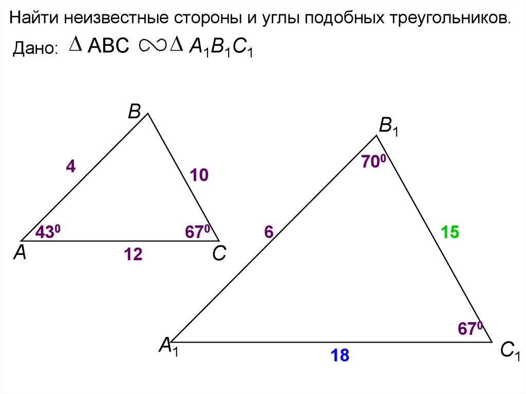 Найти неизвестные стороны и углы подобных треугольников.Дано: