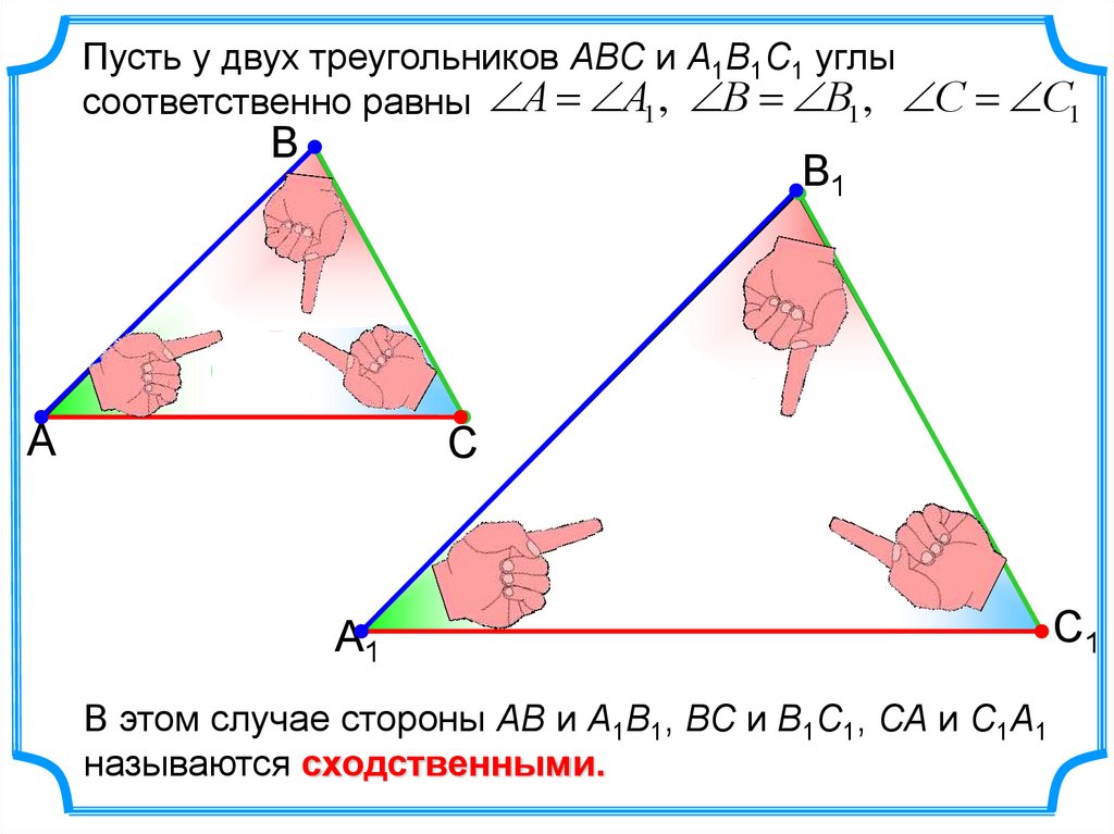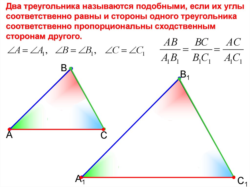 Два треугольника называются подобными, если их углысоответственно равны и стороны одного треугольника