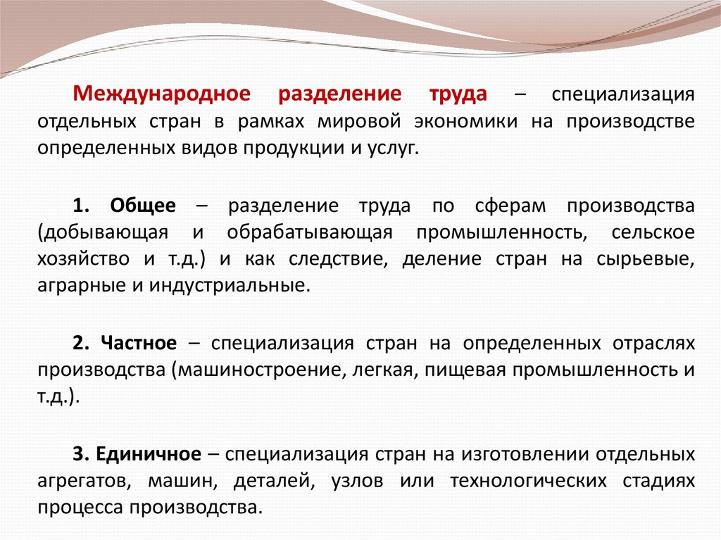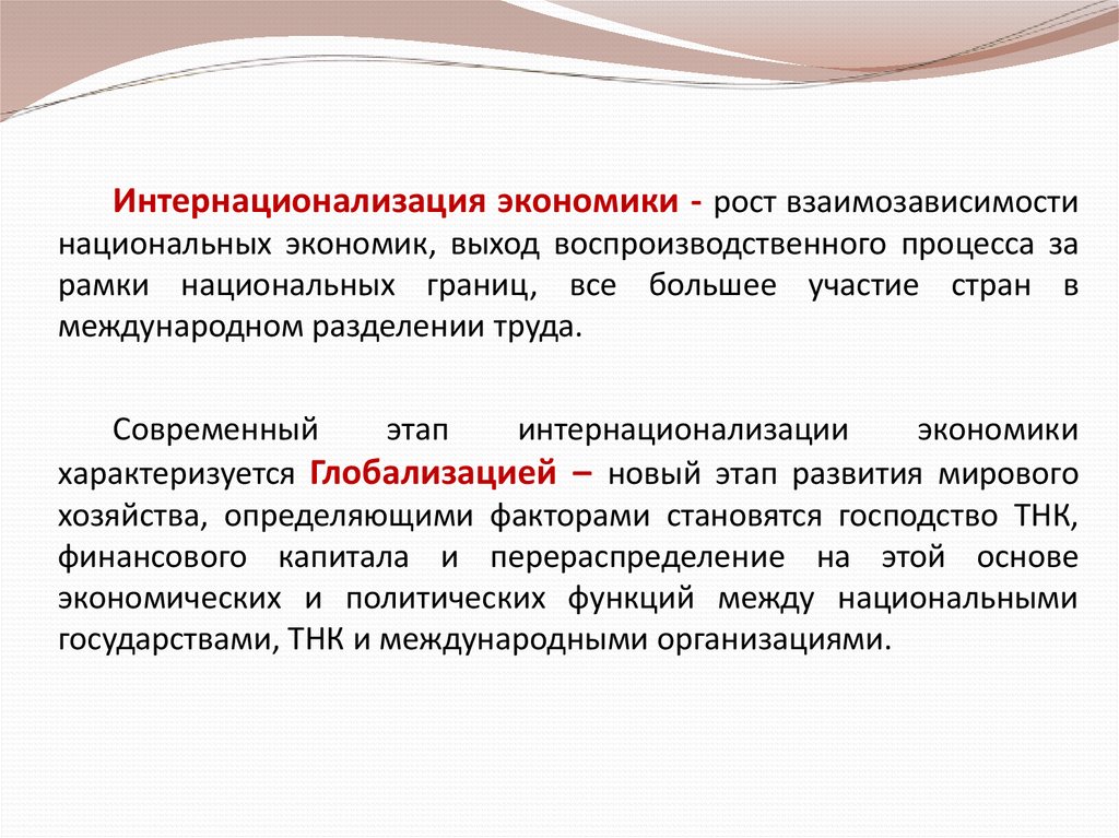 Интернационализация экономики - рост взаимозависимостинациональных экономик, выход воспроизводственного процесса за