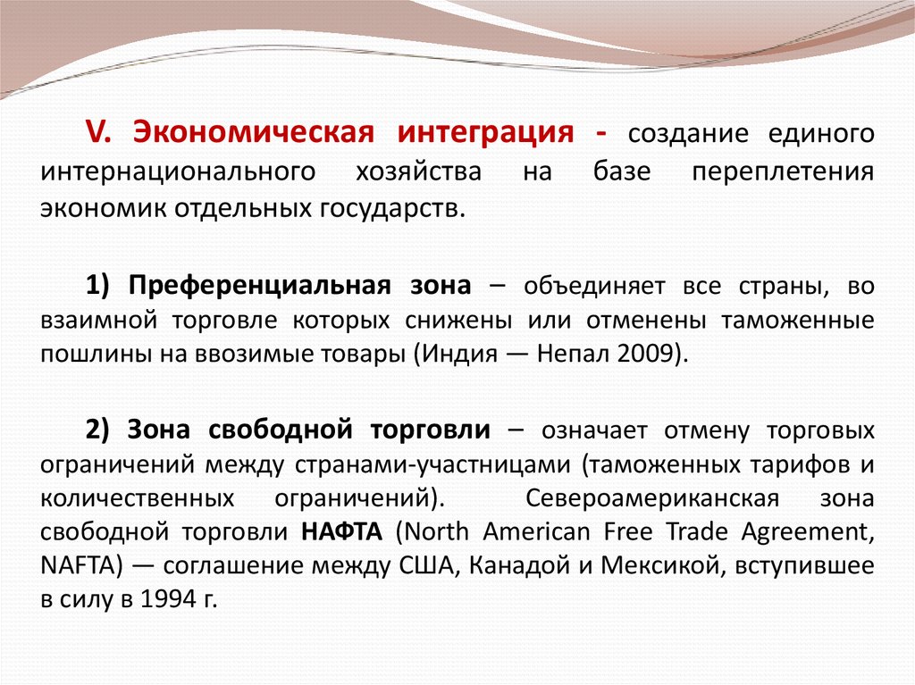 V. Экономическая интеграция - создание единогоинтернационального хозяйства