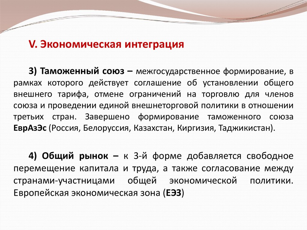 V. Экономическая интеграция3) Таможенный союз – межгосударственное формирование, в