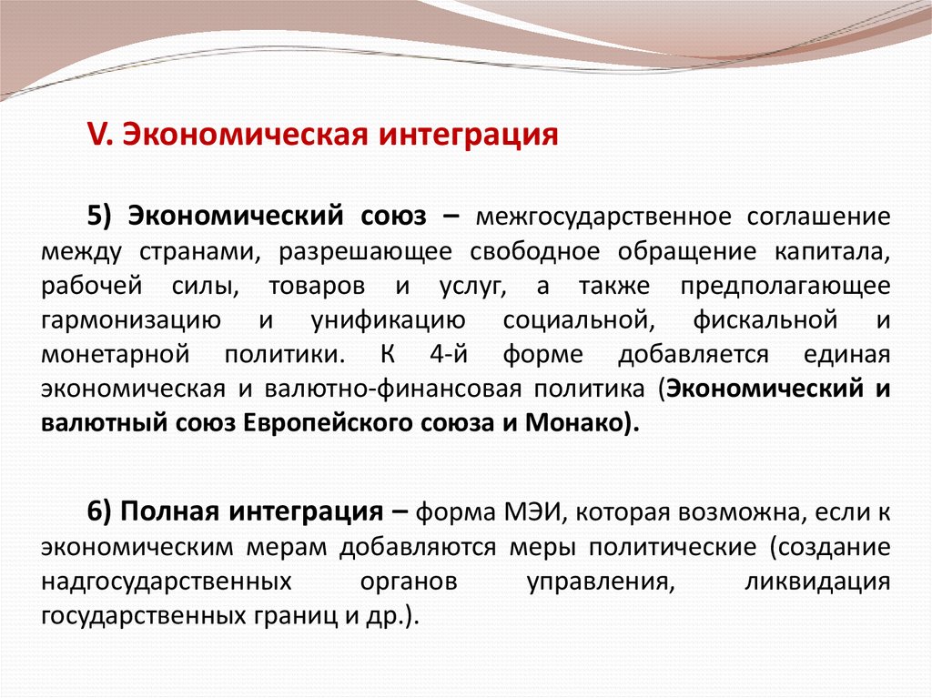 V. Экономическая интеграция5) Экономический союз – межгосударственное соглашение