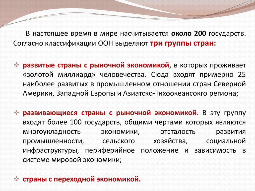 В настоящее время в мире насчитывается около 200 государств.Согласно классификации ООН выделяют три группы стран: