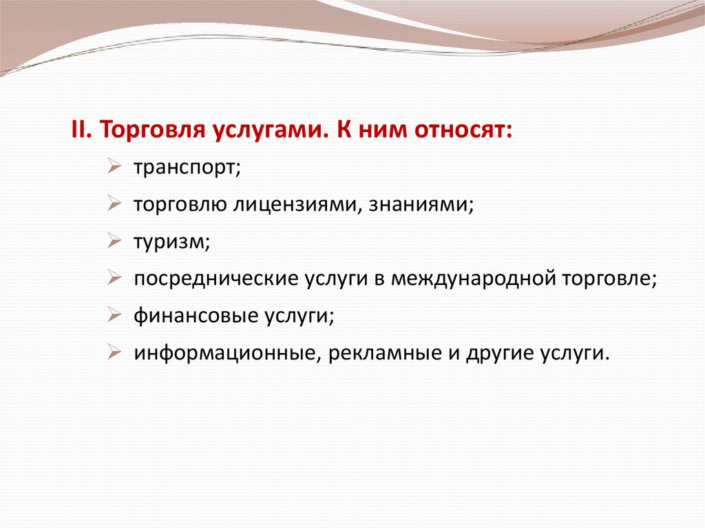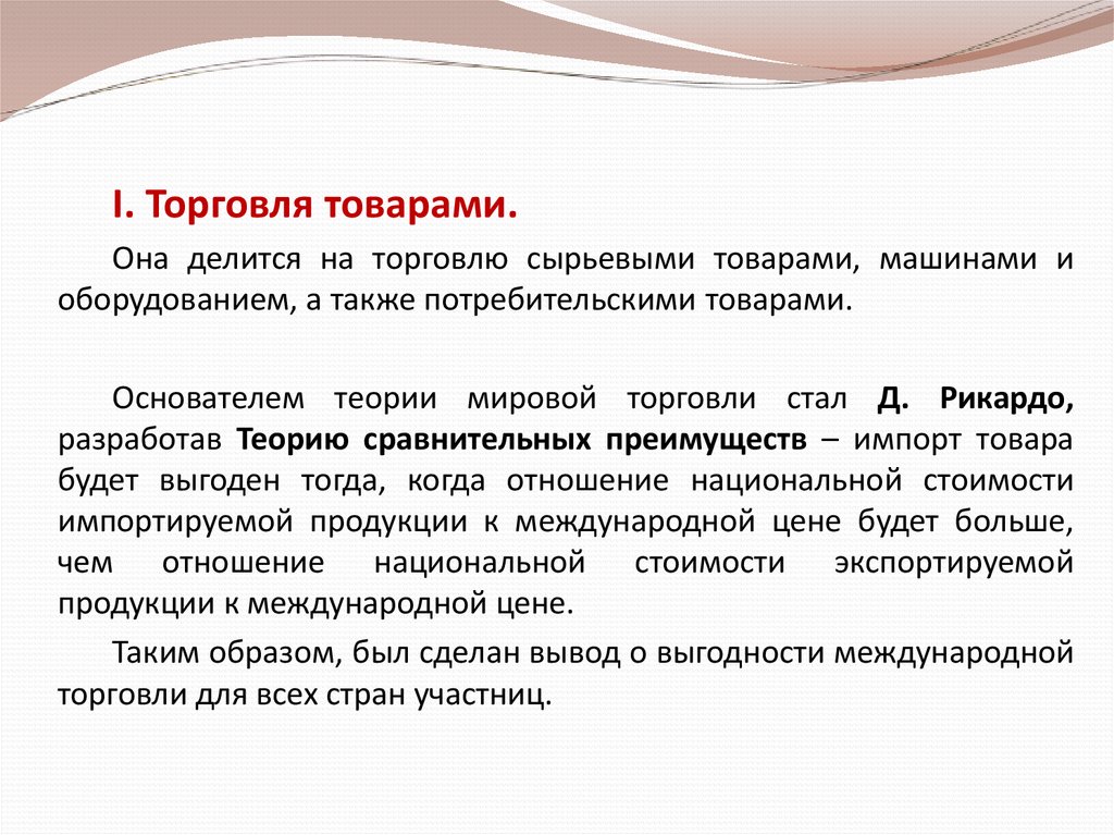 I. Торговля товарами.Она делится на торговлю сырьевыми товарами, машинами и