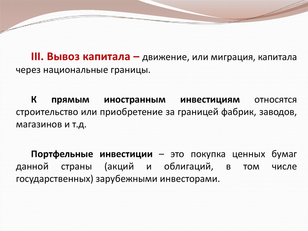 III. Вывоз капитала – движение, или миграция, капиталачерез национальные границы.