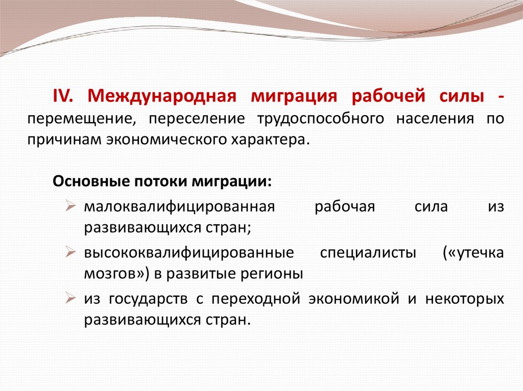 IV. Международная миграция рабочей силы перемещение, переселение трудоспособного населения попричинам экономического характера.