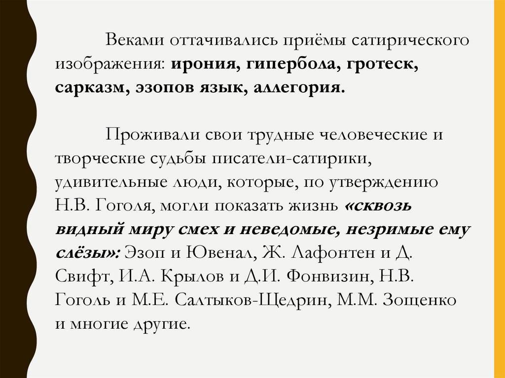 Веками оттачивались приёмы сатирическогоизображения: ирония, гипербола, гротеск,