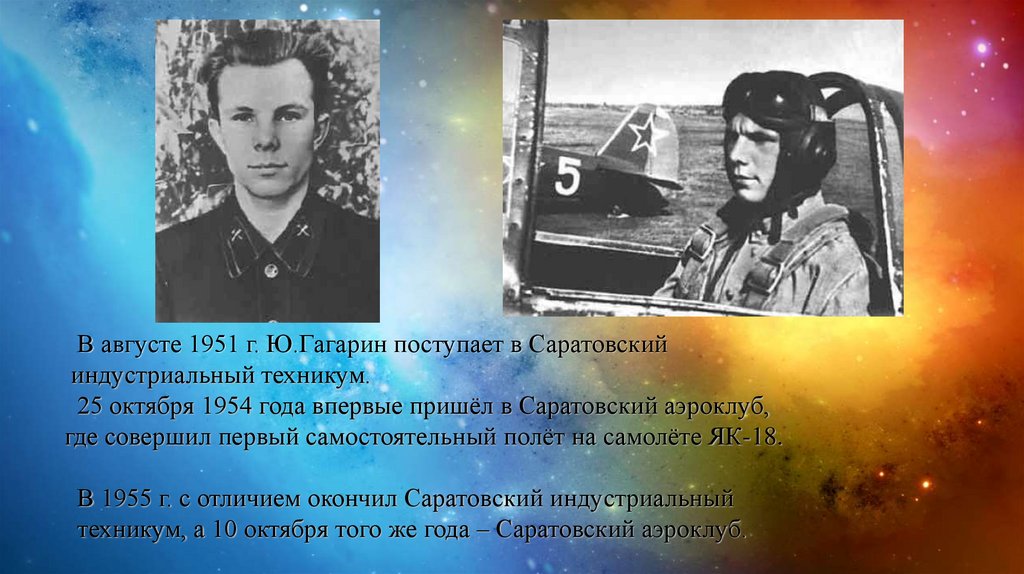 В августе 1951 г. Ю.Гагарин поступает в Саратовскийиндустриальный техникум.
