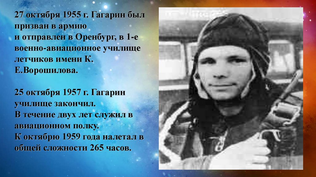 27 октября 1955 г. Гагарин былпризван в армию