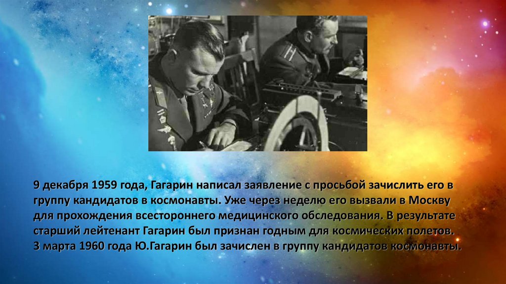 9 декабря 1959 года, Гагарин написал заявление с просьбой зачислить его вгруппу кандидатов в космонавты. Уже через неделю его вызвали в Москву