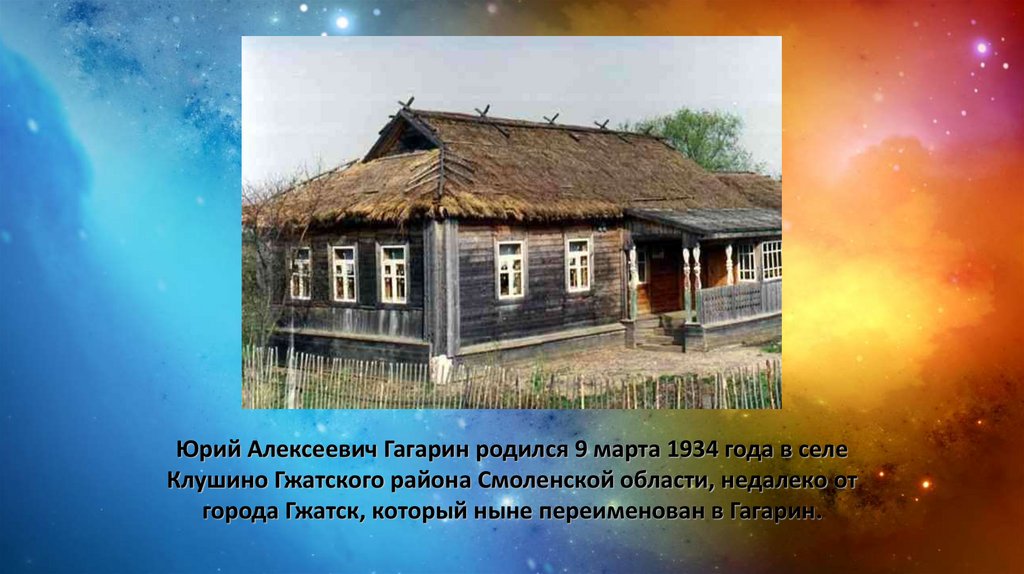 Юрий Алексеевич Гагарин родился 9 марта 1934 года в селеКлушино Гжатского района Смоленской области, недалеко от