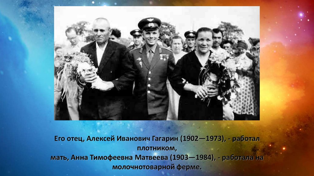 Его отец, Алексей Иванович Гагарин (1902—1973), - работалплотником,