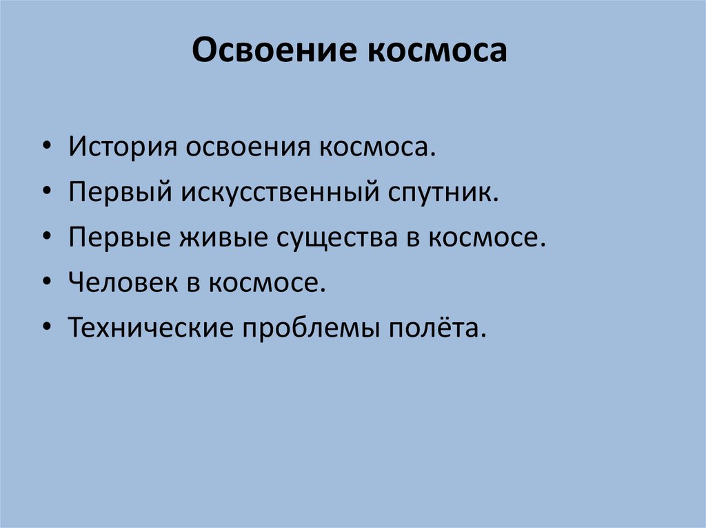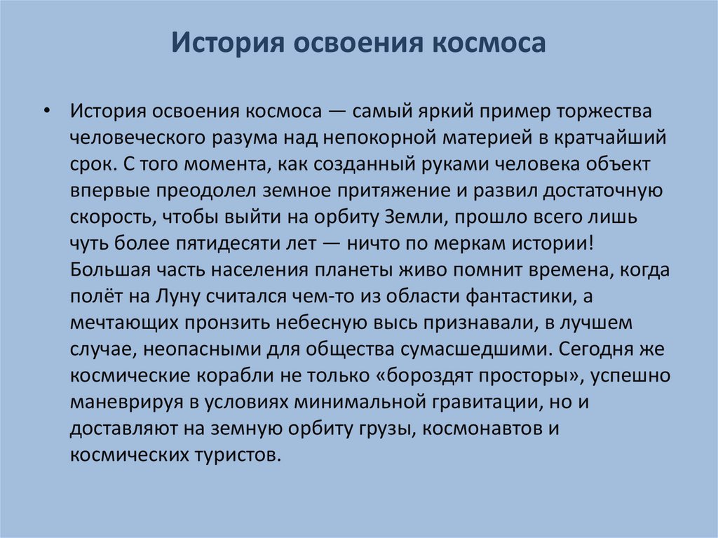 История освоения космоса• История освоения космоса — самый яркий пример торжества