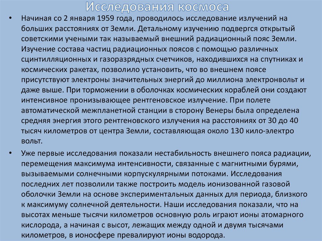 Начиная со 2 января 1959 года, проводилось исследование излучений на