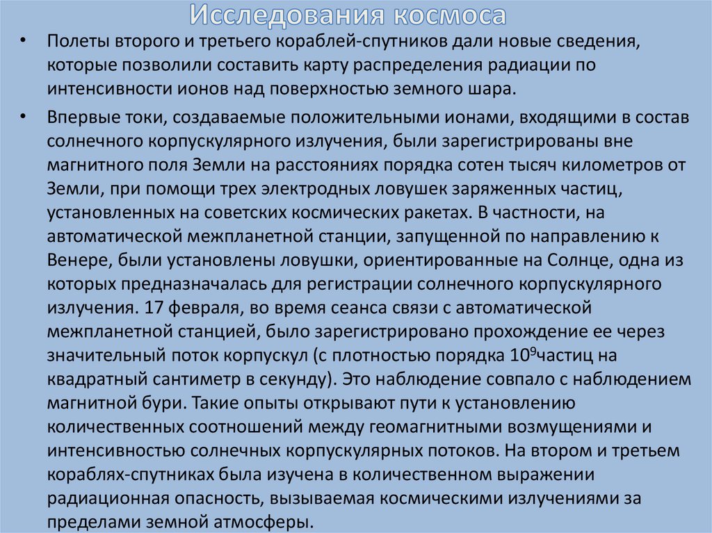 • Полеты второго и третьего кораблей-спутников дали новые сведения,которые позволили составить карту распределения радиации по