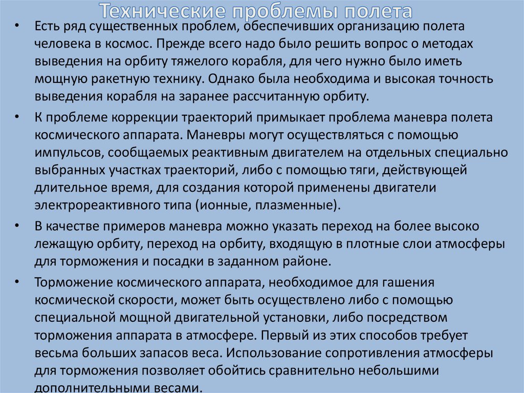 • Есть ряд существенных проблем, обеспечивших организацию полетачеловека в космос. Прежде всего надо было решить вопрос о методах