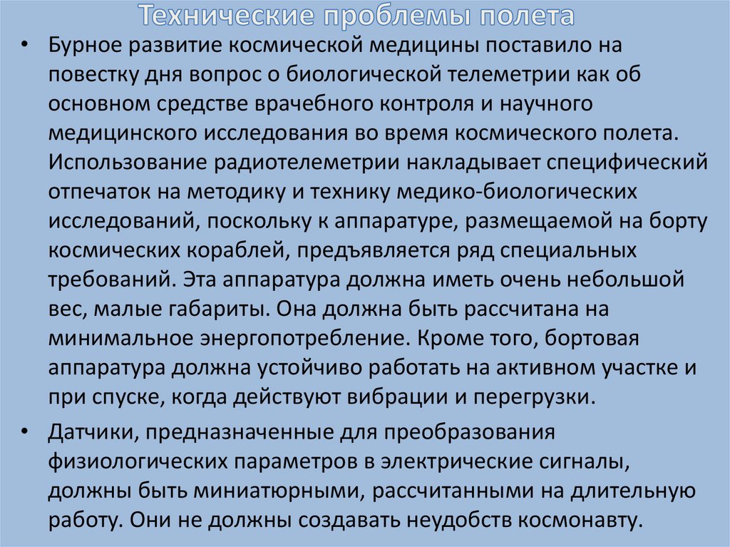 • Бурное развитие космической медицины поставило наповестку дня вопрос о биологической телеметрии как об
