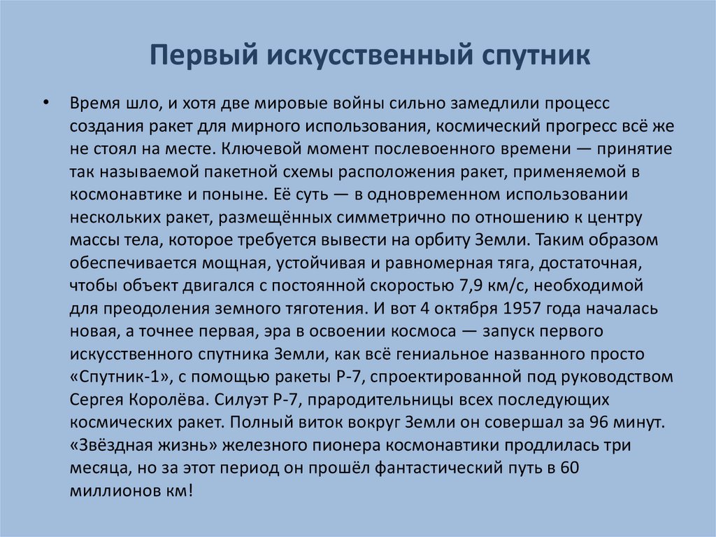 космических ракет. Полный виток вокруг Земли он совершал за 96 минут.