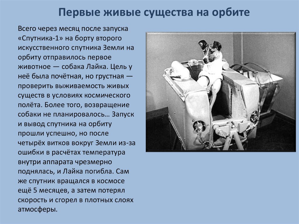 животное — собака Лайка. Цель у